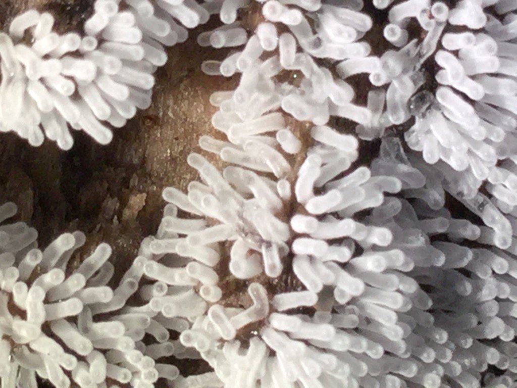新しいレンズで孔口(1-2 per.mm)を撮影した。担子器に胞子がついているのまでわかる・・